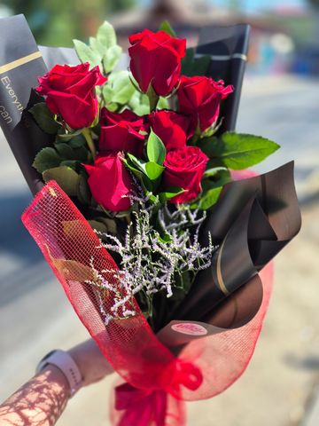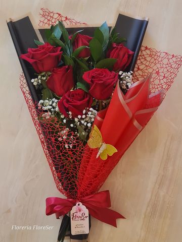 Ramo de 6 rosas ecuatorianas, envuelto en un delicado papel Coreano, cinta satín y malla araña. (incluye mariposa)