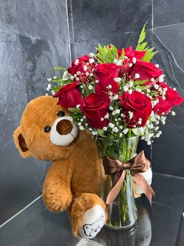 Florero vidrio con 10 rosas ecustorianas (puedes escoger color) más peluche 30 CM.