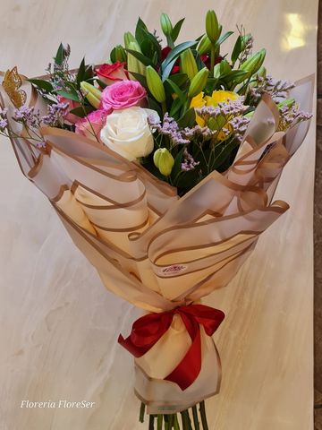 Ramo Circular compuesto por 18 rosas Ecuatorianas surtidas, 10 varas de lilium envueltos en una mixtura de papeles Coreanos varios para dar volumen y mantener la forma circular del ramo.