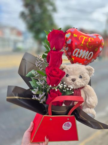 Cartera roja con 4 rosas ecuatorianas, peluche oso 22cm. globo te amo.