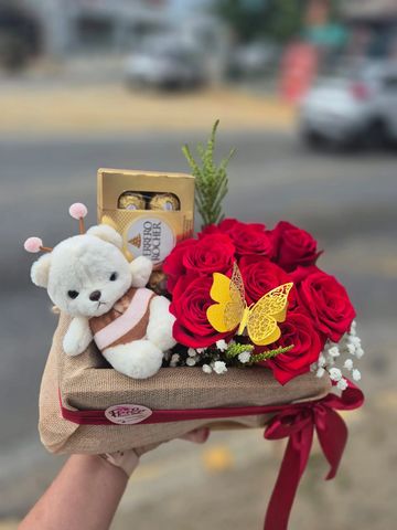 Arreglo base madera 8 rosas, peluche , chocolate Ferrero y globo.