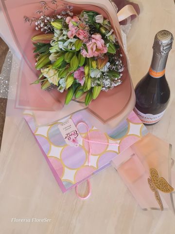 Ramo circular compuesto por Lilium y hermosas flores silvestres. Los colores pueden variar según stock, reserve con tiempo.